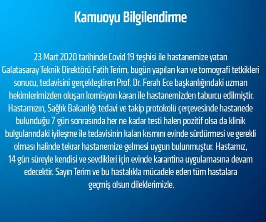 23 Mart 2020 tarihinde Covid 19 teşhisi ile hastanemize yatan Galatasaray Teknik Direktörü Fatih Terim, bugün yapılan kan ve tomografi tetkikleri sonucu, tedavisini gerçekleştiren Prof. Dr. Ferah Ece başkanlığındaki uzman hekimlerimizden oluşan komisyon kararı ile hastanemizden taburcu edilmiştir. Hastamızın, Sağlık Bakanlığı tedavi ve takip protokolü çerçevesinde hastanede bulunduğu 7 gün sonrasında her ne kadar testi halen pozitif olsa da klinik bulgulanndaki iyileşme ile tedavisinin kalan kısmını evinde sürdürmesi ve gerekli olması halinde tekrar hastanemize gelmesi uygun bulunmuştur. Hastamız, 14 gün süreyle kendisi ve sevdikleri için evinde karantina uygulamasına devam edecektir. Sayın Terim ve bu hastalıkla mücadele eden tüm hastalara geçmiş olsun dileklerimizle.