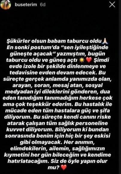 Fatih Terim'in tedavi sürecinde sık sık sosyal medya hesabından babasının durumu hakkında açıklamalarda bulunan Buse Terim Bahçekapılı, babasının tabucu olması sonrasında da açıklama yaptı.