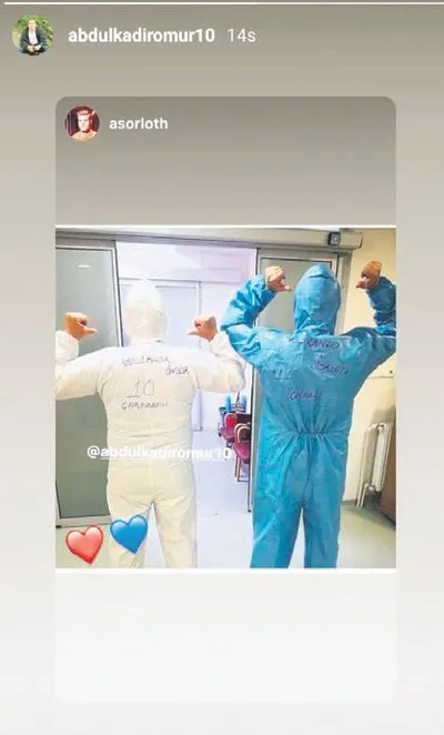 İki sağlık görevlisi kıyafetlerine Sörloth ve Abdülkadir Ömür'ün ismini yazdı. Sörltoh bu fotoğrafı paylaştı
