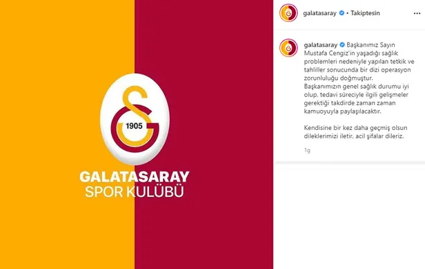 Galatasaray Kulübü'nden yapılan açıklamada, "Başkanımız Sayın Mustafa Cengiz'in yaşadığı sağlık problemleri nedeniyle yapılan tetkikler sonrasında bir dizi operasyon zorunluluğu doğmuştur. Başkanımızın genel sağlık durumu iyi olup tedavi süreciyle ilgili gelişmeler gerektiği takdirde zaman zaman kamuoyuyla paylaşılacaktır. Kendisine bir kez daha geçmiş olsun dileklerimizi iletir, acil şifalar dileriz." ifadeleri kullanıldı.
