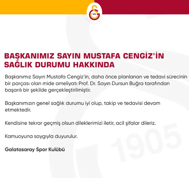 Galatasaray Başkanı Mustafa Cengiz mide kanaması sebebiyle bu sabah ameliyata alınmıştı. Galatasaray da konuyla ilgili "Başkanımız Sayın Mustafa Cengiz bu sabah ameliyata alınmış olup operasyon halen devam etmektedir. Başkanımızın genel sağlık durumu hakkında gerektiği takdirde bilgilendirme yapılacaktır. Kendisine geçmiş olsun dileklerimizi iletir, acil şifalar dileriz." açıklamasını yapmıştı