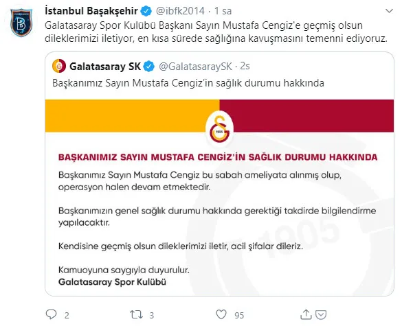 Başakşehir Kulübü'nün sosyal medya hesabından yapılan paylaşımda, "Galatasaray Spor Kulübü Başkanı Sayın Mustafa Cengiz'e geçmiş olsun dileklerimizi iletiyor, en kısa sürede sağlığına kavuşmasını temenni ediyoruz" denildi.