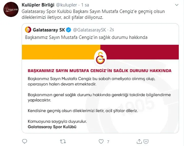 Kulüpler Birliği Vakfı'nın sosyal medya hesabından yayımlanan mesajda, "Galatasaray Spor Kulübü Başkanı Sayın Mustafa Cengiz'e geçmiş olsun dileklerimizi iletiyor, acil şifalar diliyoruz" ifadeleri kullanıldı.