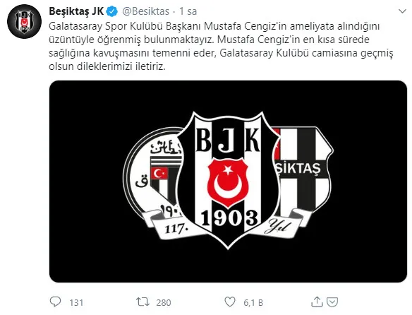 Beşiktaş Kulübü'nün Twitter hesabından yapılan açıklamada, "Galatasaray Spor Kulübü Başkanı Mustafa Cengiz'in ameliyata alındığını üzüntüyle öğrenmiş bulunmaktayız. Mustafa Cengiz'in en kısa sürede sağlığına kavuşmasını temenni eder, Galatasaray Kulübü camiasına geçmiş olsun dileklerimizi iletiriz." ifadelerine yer verildi.