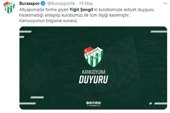 Bursa ekibi ise Şengil'in bu paylaşımı sonrası yaptığı açıklamada Yiğit Şendil'in gönderildiğini şu ifadelerle açıklamıştı:
