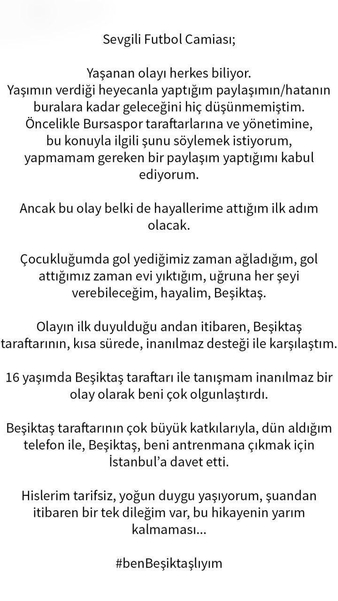 "Sevgili Futbol Camiası; Yaşanan olayı herkes biliyor.Yaşımın verdiği heyecanla yaptığım paylaşımın/hatanın buralara kadar geleceğini hiç düşünmemiştim. Öncelikle Bursaspor taraftarlarına ve yönetimine, bu konuyla ilgili şunu söylemek istiyorum, yapmamam gereken bir paylaşım yaptığımı kabul ediyorum. Ancak bu olay belki de hayallerime attığım ilk adım olacak.Çocukluğumda gol yediğimiz zaman ağladığım, gol attığımız zaman evi yıktığım, uğruna her şeyi verebileceğim, hayalim, Beşiktaş.Olayın ilk duyulduğu andan itibaren, Beşiktaş taraftarının, kısa sürede, inanılmaz desteği ile karşılaştım. 16 yaşımda Beşiktaş taraftarı ile tanışmam inanılmaz bir olay olarak beni çok olgunlaştırdı.Beşiktaş taraftarının çok büyük katkılarıyla, dün aldığım telefon ile, Beşiktaş, beni antrenmana çıkmak için İstanbul'a davet etti.Hislerim tarifsiz, yoğun duygu yaşıyorum, şuandan itibaren bir tek dileğim var, bu hikayenin yarım kalmaması... Ben Beşiktaşlıyım"