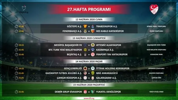 29. haftada oynanacak Medipol Başakşehir-Galatasaray maçı 28 Haziran Pazar günü, 30. haftadaki Galatasaray-Trabzonspor maçı 5 Temmuz Pazar günü oynanacak.