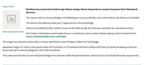 Fotomaç'ın derlediği haberde, geçen yaz 4 milyon Euro'ya Almanya ekibi Fortuna Düsseldorf'a transferi gerçekleşen Nana Ampomah'ın siyah-beyazlıların gündeminde olduğu ileri sürüldü. Haberin Beşiktaş'ın oyuncuyu kiralık olarak kadroya katmak istediği bilgisine de yer verildi.