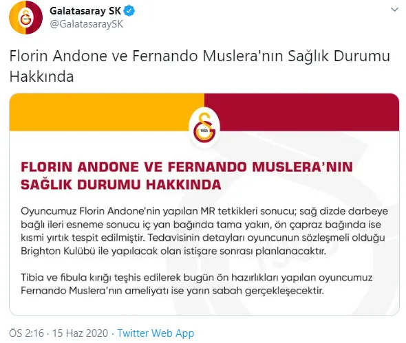 Galatasaray'ın Süper Lig'in 27.haftasında Çaykur Rizespor deplasmanında oynadığı maçta Florin Andone ve Fernando Muslera sakatlanmıştı. Galatasaray, Rizespor ile oynadıkları maçta sakatlanan Muslera ve Andone için resmi siteden bir açıklama yaptı. Yapılan açıklamada Florin Andone'nin son durumu ve Muslera'nın ameliyat tarihi belirtildi.