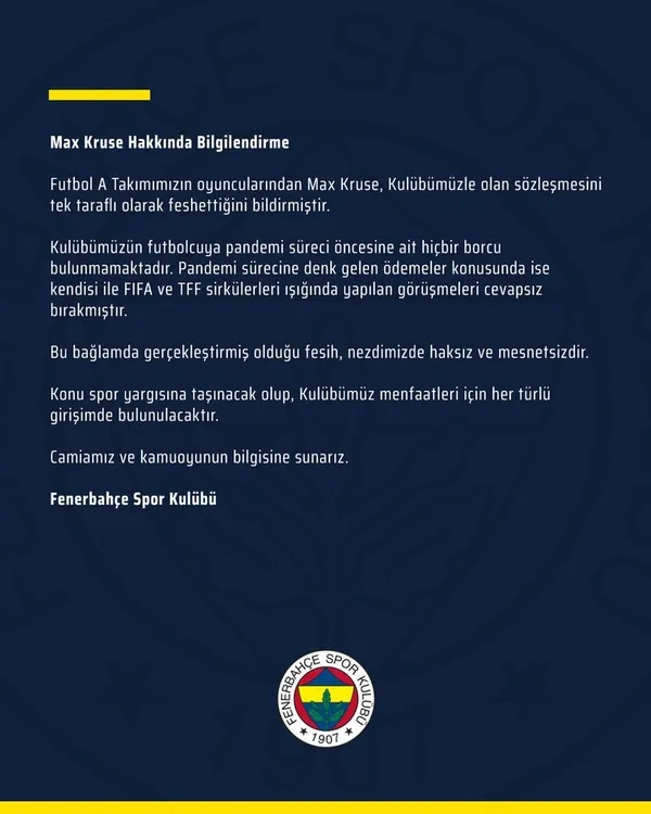 Fenerbahçe'den son dakika açıklaması... Fenerbahçe Kulübü resmi kanallarından yaptığı açıklamada, Alman futbolcu Max Kruse'nin sözleşmesini tek taraflı olarak feshettiğini açıkladı. Yapılan açıklamada '''Futbol A Takımımızın oyuncularından Max Kruse, Kulübümüzle olan sözleşmesini tek taraflı olarak feshettiğini bildirmiştir'' ifadelerine yer verilirken Sarı lacivertliler kararı mahkemeye taşıyacağını da belirtti.