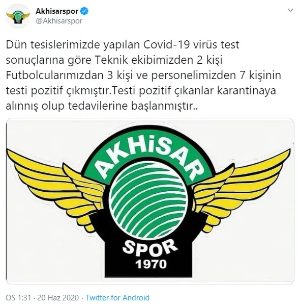 Konuyla ilgili Akhisarspor kulübü resmi açıklamada bulundu. Açıklamada, "Dün tesislerimizde yapılan Covid-19 virüs test sonuçlarına göre Teknik ekibimizden 2 kişi Futbolcularımızdan 3 kişi ve personelimizden 7 kişinin testi pozitif çıkmıştır.Testi pozitif çıkanlar karantinaya alınnış olup tedavilerine başlanmıştır." ifadelerine yer verildi.