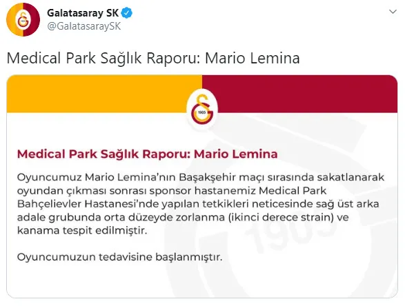 Süper Lig'in 29. haftasında oynanan Medipol Başakşehir-Galatasaray maçında sakatlanan yıldız isim Mario Lemina'nın sağlık durumu hakkında sarı-kırmızılılar açıklamada bulundu. Açıklamada 'Mario Lemina'nın sağ üst arka adale grubunda orta düzeyde zorlanma (ikinci derece strain) ve kanama tespit edilmiştir.' denildi.