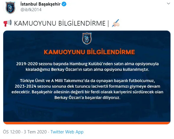 2019-2020 sezonu başında Hamburg Kulübünden satın alma opsiyonuyla kiraladığımız Berkay Özcan'ın satın alma opsiyonu kullanılmıştır. Başakşehir ailesinin değerli bir ferdi olarak kariyerini sürdürecek olan Berkay Özcan'a başarılar diliyoruz."