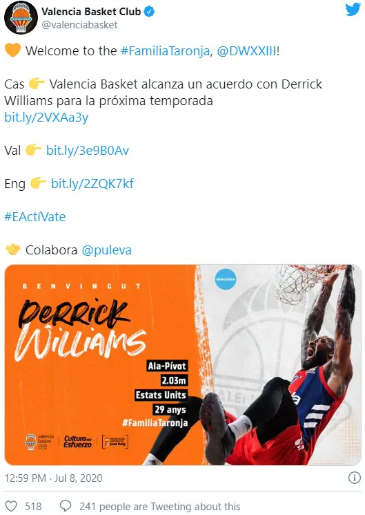 THY EuroLeague ekiplerinden Valencia, Fenerbahçe Beko'dan ayrılan Derrick Williams'ı kadrosuna kattığını resmen açıkladı. İspanyol ekip, tecrübeli oyuncu ile 1 yıllık sözleşme imzaladı. 29 yaşındaki yıldız, geçen sezon 11.3 sayı 3.9 ribaund 1.2 asist 1.1 top çalma ile forma giydi.