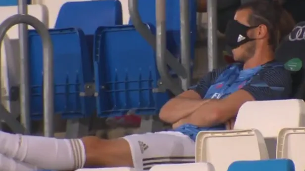Karşılaşmaya yedek başlayan Bale, yedek kulübesinde otururken koronavirüs önlemleri nedeniyle takması zorunlu olan maskeyi gözüne taktı ve uyudu.