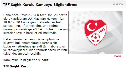 Daha önce Covid-19 PCR testi sonucu pozitif olarak açıklanan Üst Klasman Hakemimizin 10.07.2020 Cuma günü tekrarlanan test sonucu negatif çıkmış olmasına rağmen normal prosedür gereği 14 günlük izolasyon süresine uygun hareket edilmektedir.