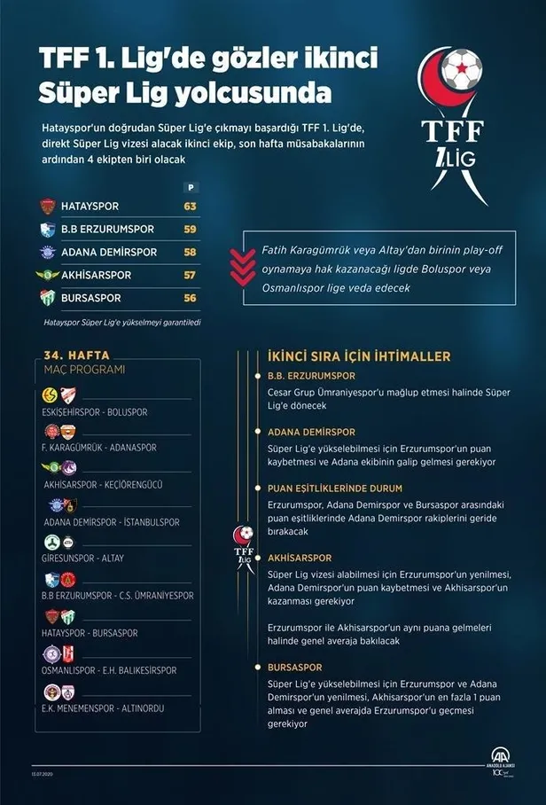 Son hafta maçları öncesinde 59 puanlı Büyükşehir Belediye Erzurumspor, 58 puana sahip Adana Demirspor, 57 puana ulaşan Akhisarspor ve 56 puanlı Bursaspor ikinci sıra için iddiasını sürdürüyor.