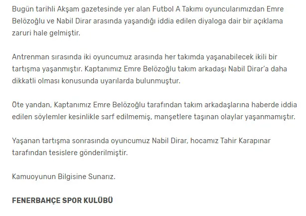 Bugün tarihli Akşam gazetesinde yer alan Futbol A Takımı oyuncularımızdan Emre Belözoğlu ve Nabil Dirar arasında yaşandığı iddia edilen diyaloga dair bir açıklama zaruri hale gelmiştir.