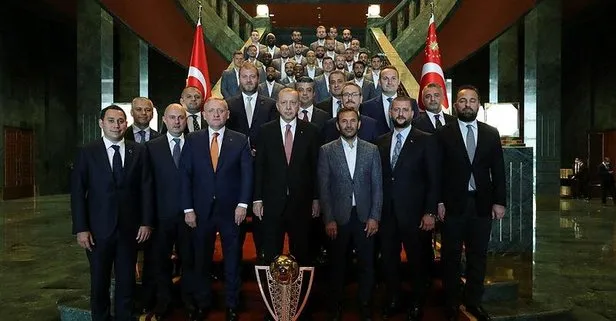 Başkan Recep Tayyip Erdoğan, Süper Lig'de şampiyon olan Başakşehir'in Başkanı Göksel Gümüşdağ ile teknik heyet ve futbolcuları kabul etti.