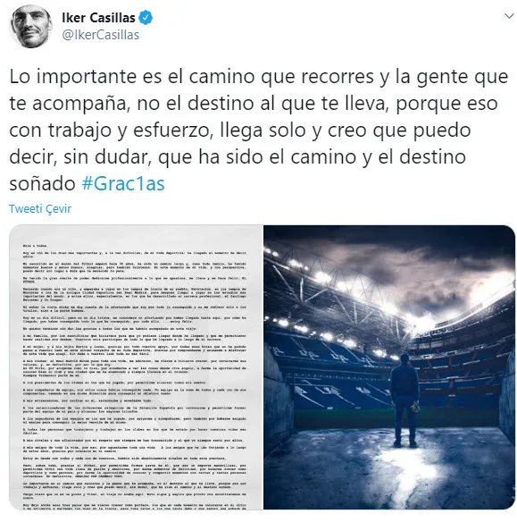 Dünyaca ünlü İspanyol kaleci Iker Casillas bugün yaptığı açıklamada futbol bıraktığını duyurdu. Kariyerine 1996 yılında Real Madrid altyapısında başlayan Casillas, 1999-2015 yılları arasında bu takımın formasını giymişti.
