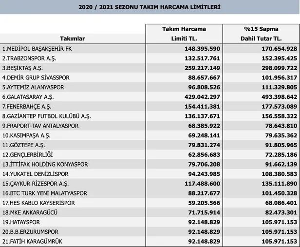 Kulüp Lisans Kurulu, 3 Ağustos 2020 tarihli toplantısında 2020-2021 Sezonu Süper Lig Takım Harcama Limitleri'ni belirledi. Bu rakamlara göre en çok harcama limitine sahip olan takım 429 milyon 42 bin 297 TL ile Galatasaray oldu. Listede 2. sırada 259 milyon 217 bin 149 TL ile Beşiktaş , 3. sırada 154 milyon 411 bin 381 TL ile Fenerbahçe yer aldı.