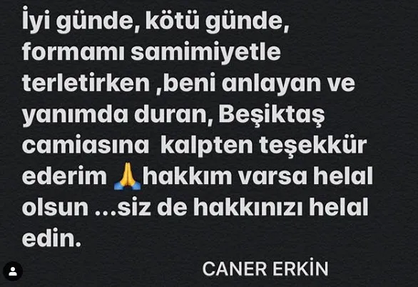 Caner Erkin sosyal medya hesaplarından Beşiktaş'a veda mesajı yayınladı. Caner Erkin mesajında şu ifadelere yer verdi: