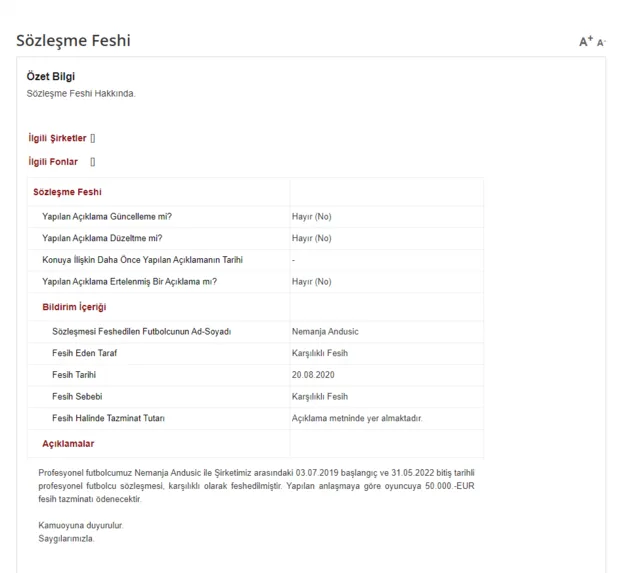 Profesyonel futbolcumuz Nemanja Andusic ile Şirketimiz arasındaki 03.07.2019 başlangıç ve 31.05.2022 bitiş tarihli profesyonel futbolcu sözleşmesi, karşılıklı olarak feshedilmiştir. 50.000.-EUR fesih tazminatı ödenecektir.