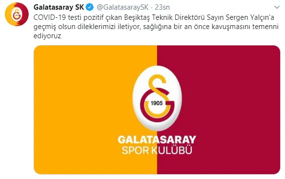 Bir geçmiş olsun mesajı da, daha önce teknik direktörü Fatih Terim'in koronavirüse yakalandığı Galatasaray'dan geldi. Sarı-kırmızılıların paylaşımında şu sözlere yer verildi: