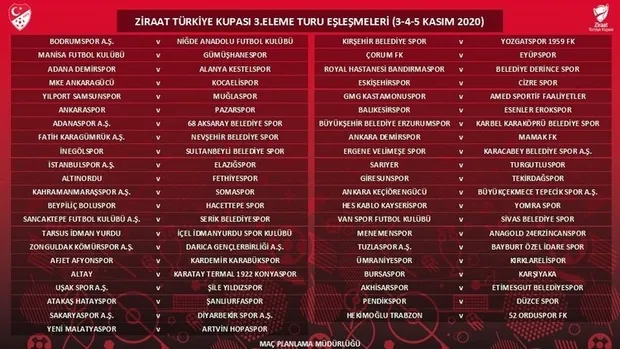 Türkiye Kupası'nda heyecan kura çekimiyle sürdü. Ziraat Türkiye Kupası 3. Eleme Turu kura çekimi, TFF Hasan Doğan Milli Takımlar Kamp ve Eğitim Tesisleri'nde yapıldı. Zorlu karşılaşmalar 3,4,5 Kasım tarihinde A Spor'dan yayınalanacak.