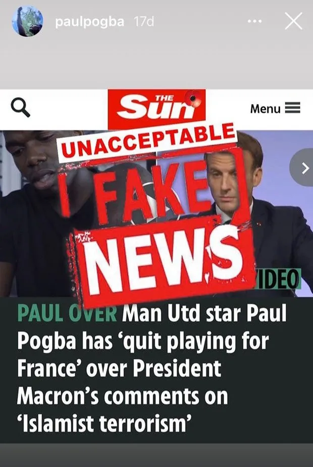 Fransız yıldız Paul Pogba’nın Fransa Cumhurbaşkanı Emmanuel Macron’un terörizmi İslamiyet ile ilişkilendiren skandal açıklamalarının ardından tepkisini göstererek, Fransa Milli Takımı’nı bıraktığı iddia edilmişti. Fransız futbolcu Pogba'dan bu iddiaya Instagram hesabından yanıt verdi. Fransa Milli Takımı'nı bıraktığı iddia edilen Müslüman futbolcu Paul Pogba, İngiliz basınında çıkan haberleri yalanladı.