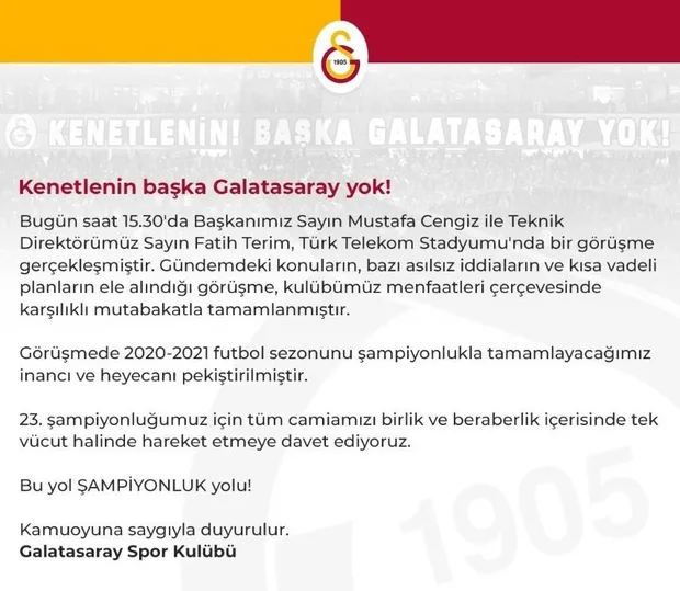 Toplantının ardından Galatasaray Kulübü de resmi internet sitesi aracılığıyla bir açıklama yayınladı. Kulüpten yapılan açıklamada şu ifadeler kullanıldı; "Bu yol şampiyonluk yolu, kenetlenin başka Galatasaray yok"