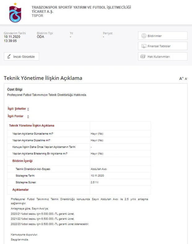 "Profesyonel Futbol Takımımız Teknik Direktörlüğü konusunda Sayın Abdullah Avcı ile 2,5 yıllık anlaşma sağlanmıştır.