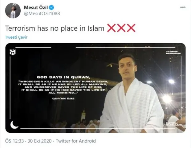 Özil daha öncede İslamofobi ile ilgili paylaşımlarıyla adında söz ettirmişti. Mesut Özil, sosyal medyadan 'İslam'da terörün yeri yoktur' sözleriyle Maide Suresi'nin 32. ayetini paylaşmıştı.