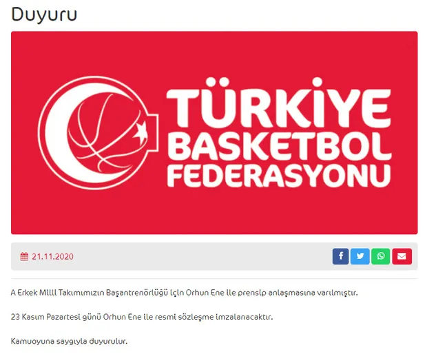 Türkiye Basketbol Federasyonu, Ufuk Sarıca'dan boşalan A Milli Takım Başantrenörlük görevi için Orhun Ene ile prensip anlaşmasına varıldığını açıkladı. Ene ile pazartesi günü resmi sözleşme imzalanacak.