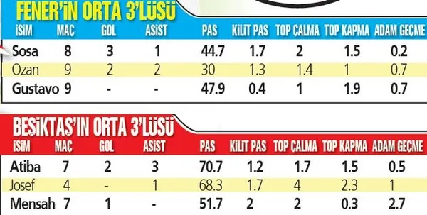Fenerbahçe'de Gustavo-Sosa- Ozan üçlüsü ile Beşiktaş'ta Atiba-Josef- Mensah üçlüsü takımlarının en dominant güçleri oldular. Maçlara etkileri hücumda ve savunmada üst seviyede oldu.