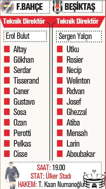 Süper Lig'in 10. haftasında Fenerbahçe ile Beşiktaş bugün 19.00'da Ülker Stadı'nda karşı karşıya gelecek Derbiyi hakem Tugay Kaan Numanoğlu yönetecek. F.Bahçe'de covid-19 testi pozitif çıkan Valencia ile sakatlıkları bulunan Samatta ve kaleci Harun kadroda yer almayacak. Beşiktaş'ta ise yine covid-19 testi pozitif olan Hasic ve Vida, sakatlığı bulunan Gökhan Töre, kart cezalıları kaleci Ersin ve Dorukhan derbide yok.