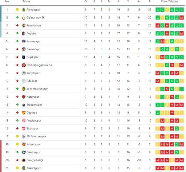 Haftayı 3 puanla kapatan Galatasaray, sarı-lacivertlilerle aynı puana ulaşırken, iki haftadır kazanan Trabzonspor 13. sıraya yükseldi. Konyaspor'u 1-0 yenen Alanyaspor ise 1 maçı eksik olmasına rağmen 23 puana ulaşarak liderliğini sürdürdü.