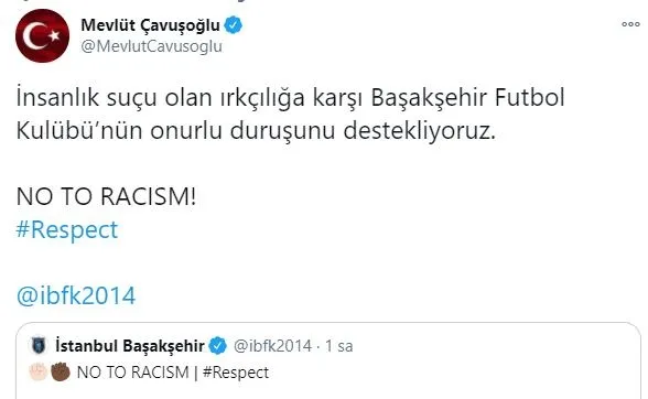 Dışişleri Bakanı Mevlüt Çavuşoğlu, "İnsanlık suçu olan ırkçılığa karşı Başakşehir Futbol Kulübü'nün onurlu duruşunu destekliyoruz" dedi.