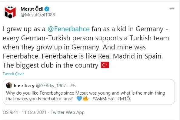 Fenerbahçe'nin transfer gündemindeki Mesut Özil, Twitter üzerinden kendisine gelen soruları yanıtladı. Taraftarların yolunu gözlediği yıldız, "Almanya'da Fenerbahçe taraftarı olarak büyüdüm. Fenerbahçe, Real Madrid'in İspanya'da olduğu gibi, Türkiye'nin en büyük kulübü" ifadelerini kullandı.