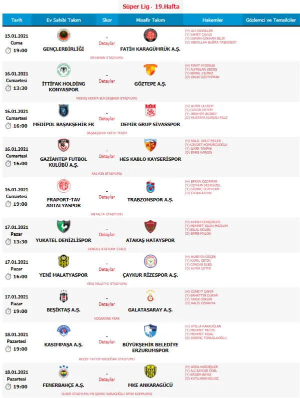 İŞTE SÜPER LİG'DE 19. HAFTANIN PROGRAMI VE HAKEMLER