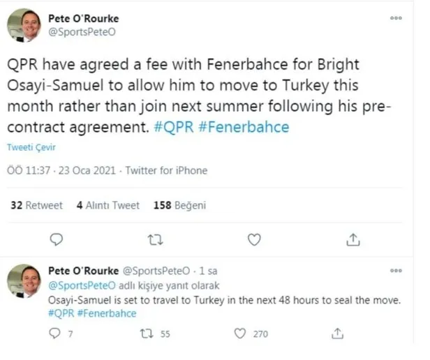 Fenerbahçe’nin önümüzdeki sezondan itibaren 4 yıllık sözleşme imzaladığı Osayi-Samuel’in devre arasında Sarı-Lacivertli takıma katılacağı iddia edildi. İngiliz gazeteci Pete O'Rourke Twitter hesabından 48 saat içinde Türkiye’de olacağını duyurdu.