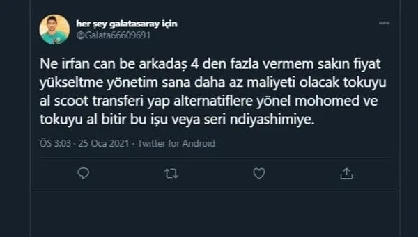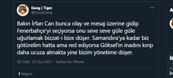 Yönetimin yanında yer alan sarı-kırmızılı taraftarlar "İrfan Can'ı Fener istiyorsa hemen masadan kalkın. Bu fiyatlara transfer yapılmaz. Fener, İrfan Can'ın hayrını görsün" ifadesini kullandı.