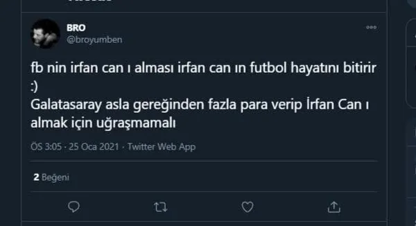 Konuyla ilgili konuşan Başakşehir CEO'su Mustafa Eröğüt, "Fenerbahçe, cuma günü İrfan Can ile ilgilendiklerini ve görüşmek istediklerini tarafımıza iletti. Henüz resmi bir teklif yok. Önümüzdeki günlerde görüşme gerçekleştireceğiz." dedi.
