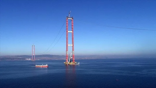 1915 Çanakkale Köprüsü'nü iki Türk, iki de Güney Koreli olarak 4 ortak yapıyoruz. Köprünün kuleleri tamamlandı. Çelik halatların yapımı için gerekli olan kedi yolu da bitti. Çelik halatların montajı ile ilgili süreçteyiz. Bağlantı yolları ve devamındaki otobanın da inşaatı büyük ölçüde bitti. Tabliyeler de sahaya gelmeye başladı. İnşallah 18 Mart 2022'de köprü ve otoyolu halkımızın hizmetine sunacağız.