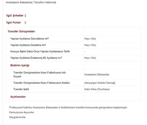 Trabzonspor Sportif Yatırım ve Futbol İşletmeciliği Ticaret AŞ'den Borsa İstanbul'a gönderilen ve Kamuyu Aydınlatma Platformunda (KAP) da yer alan iki ayrı açıklamada, profesyonel futbolcular Yunus Mallı ile Anastasios Bakasetas'ın bodo-mavili kulübe transferleri konusunda görüşmelere başlandığı ifade edildi.