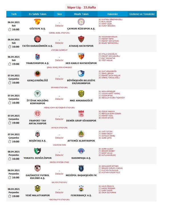 Öte yandan Yeni Malatyaspor-Fenerbahçe maçını Halis Özkahya, Trabzonspor-Kayserispor maçını ise Atilla Karaoğlan yönetecek.