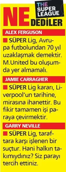 Avrupa futbolunda kılıçlar çekildi. Başını Barcelona, R.Madrid ve M.United'ın çektiği 12 dev kulübün imzasıyla Avrupa Süper Ligi resmen kuruldu, ortalık savaş yeri oldu. Yapılan açıklamaya göre 20 takımın katılacağı organizasyon ağustos ayında başlayacak ve lig formatında oynanacak.
