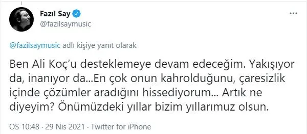 Ben Ali Koç'u desteklemeye devam edeceğim. Yakışıyor da, inanıyor da...En çok onun kahrolduğunu, çaresizlik içinde çözümler aradığını hissediyorum... Artık ne diyeyim? Önümüzdeki yıllar bizim yıllarımız olsun.