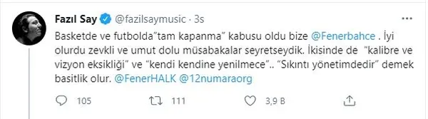 Fenerbahçe'nin Alanyaspor karşısında puan kaybederek şampiyonluk yolunda ağır yara alması piyanist Fazıl Say'ı çileden çıkardı. Fenerbahçe kötü sonuçlar aldığında verdiği görüntülerle sosyal medyanın diline düşen Say bu kez Twitter'dan peş peşe paylaşımlar yaptı. Kötü gidişi eleştiren Say, Fenerbahçe ve Ali Koç'a da kendince önerilerde bulundu.
