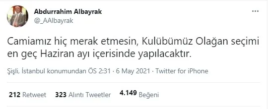 Twitter hesabından bir paylaşım yapan Albayrak'ın açıklaması şöyle: "Camiamız hiç merak etmesin, kulübümüz olağan seçimi en geç haziran ayı içerisinde yapılacaktır."